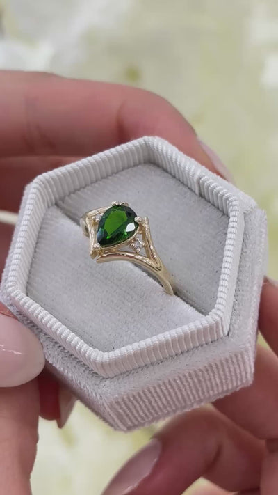 1.03 ct krom diopsit taşı ve 0.03 ct pırlanta ile hazırlanan bu yüzük, 14 ayar altın üzerine el işçiliğiyle üretilmiştir.