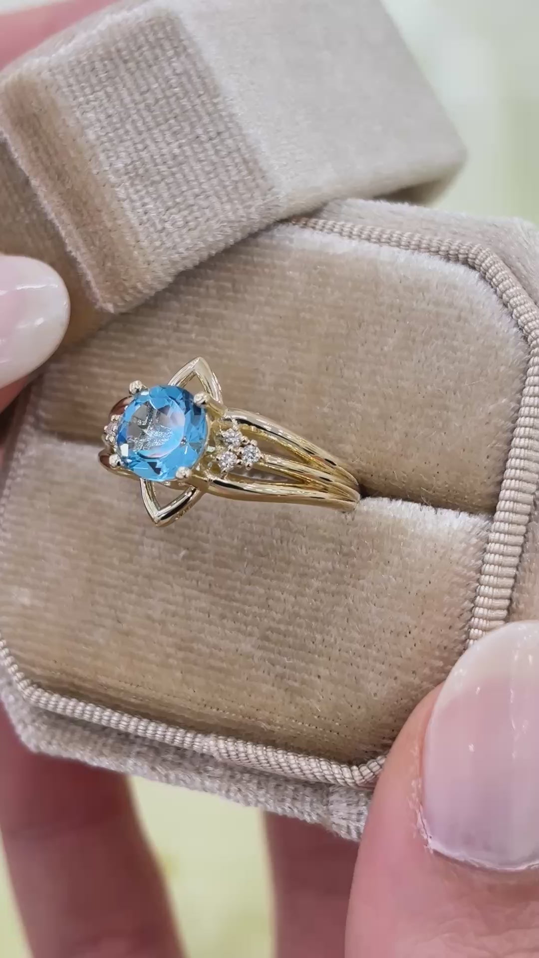 1,50 ct Swiss Blue Topaz taşı ve 0,06 ct pırlanta ile hazırlanan bu yüzük, 14 ayar altın üzerine el işçiliğiyle üretilmiştir.
