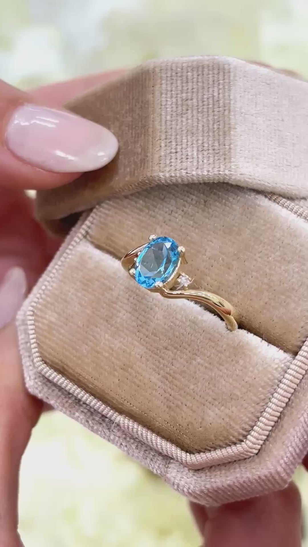 1,00 ct Swiss Blue Topaz taşı ve 0,03 ct pırlanta ile hazırlanan bu yüzük, 14 ayar altın üzerine el işçiliğiyle üretilmiştir.
